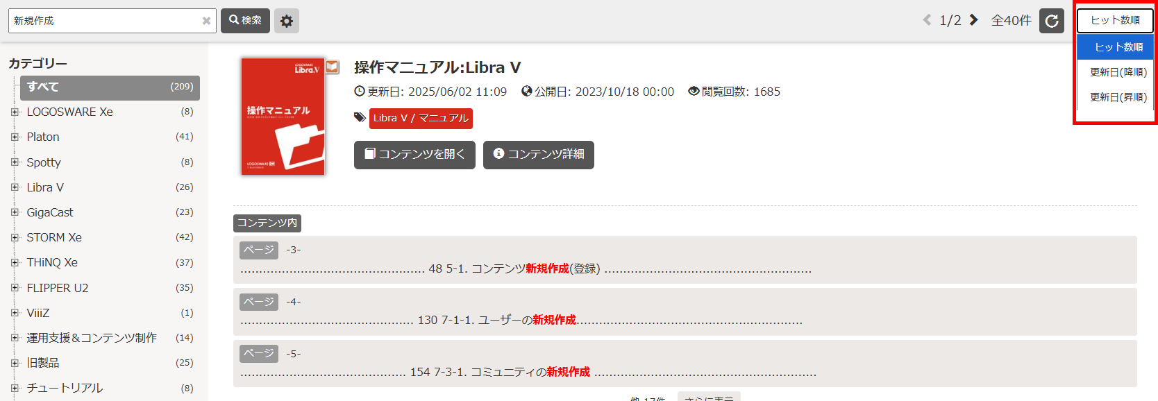- ヒット数順: 検索キーワードが多く含まれているコンテンツが上位に表示されます。