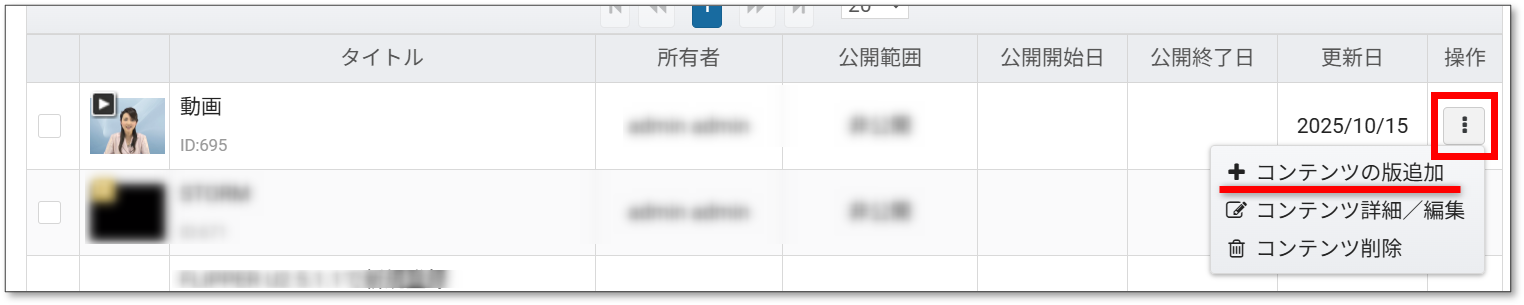 - 対象コンテンツの縦三点ボタン(︙)をクリックし、[コンテンツの版追加]を選択します。