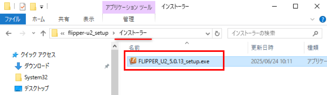 - 解凍したフォルダ内の「インストーラー」フォルダにある実行ファイル(.exe)をダブルクリックして、インストールを開始します。