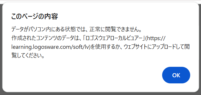 このアラートは、作成されたコンテンツデータのindex.htmlを、お使いのパソコンのデスクトップやダウンロードフォルダなど、ローカル環境から直接ブラウザで開こうとした場合に表示されます。