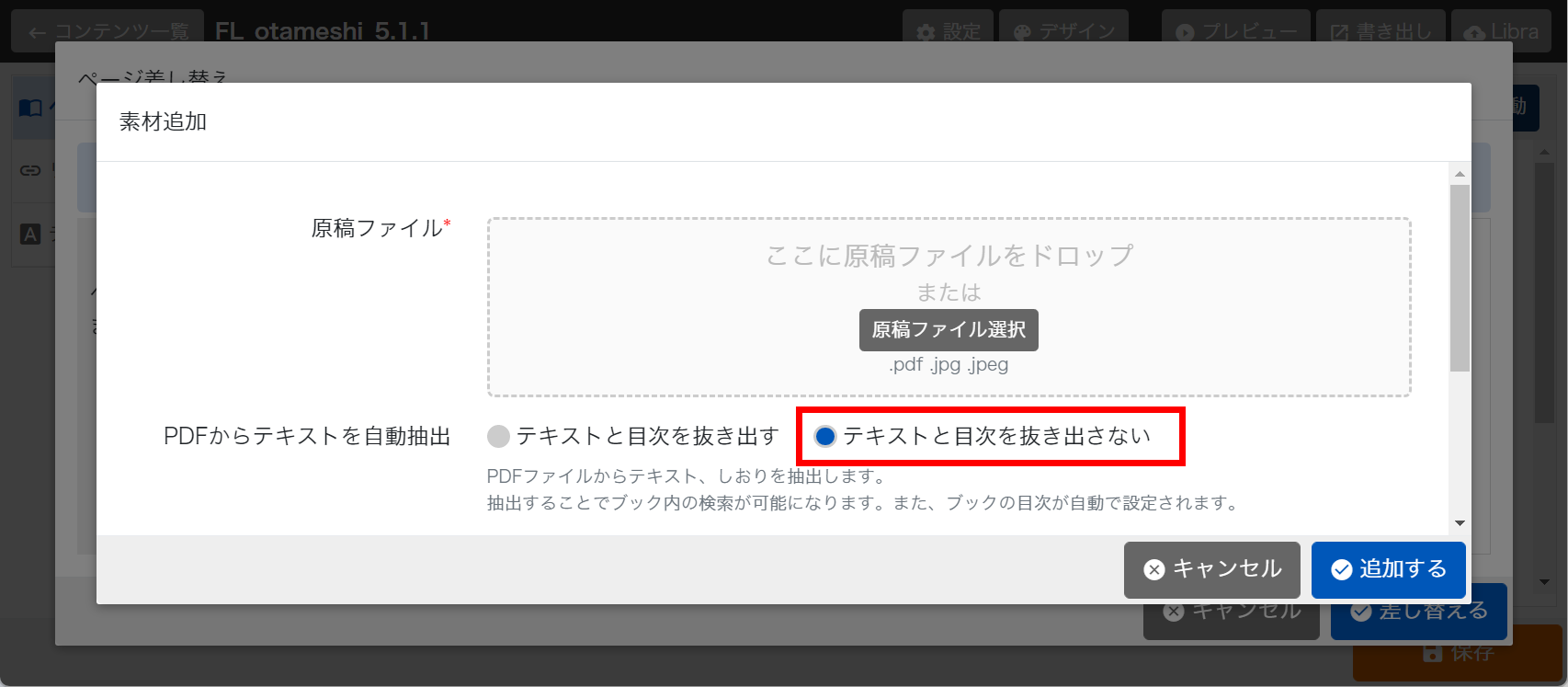 - 原稿ファイルを追加する際、設定を「テキストと目次を抜き出さない」に変更し、「追加する」をクリックします。