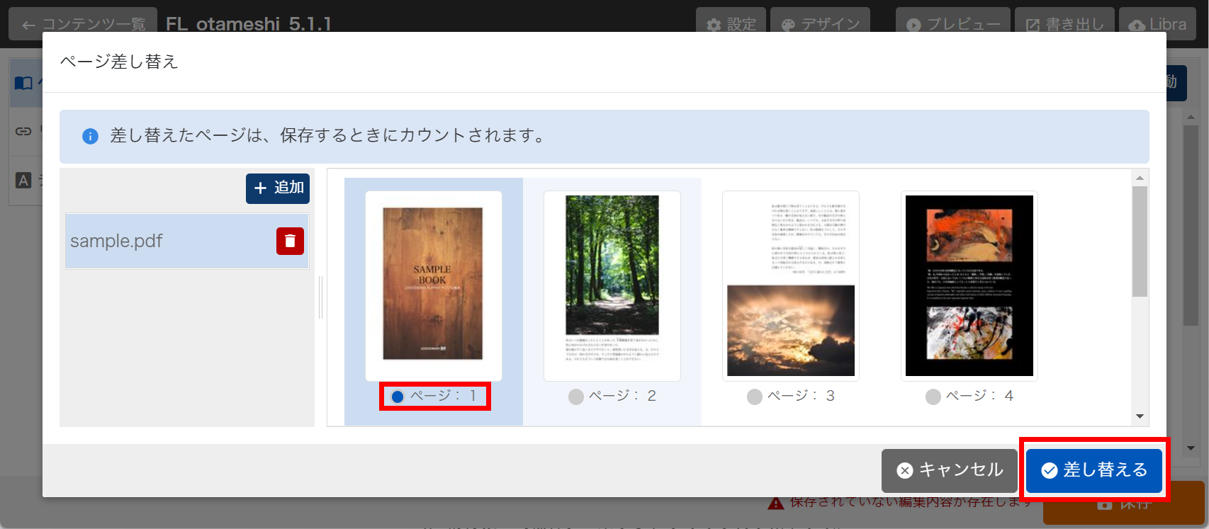 - 差し替えたい元のページを選択し、「差し替える」をクリックします。